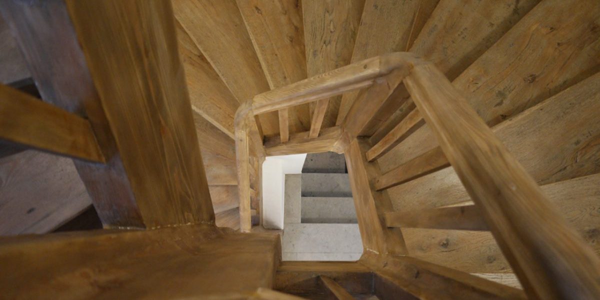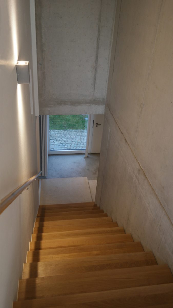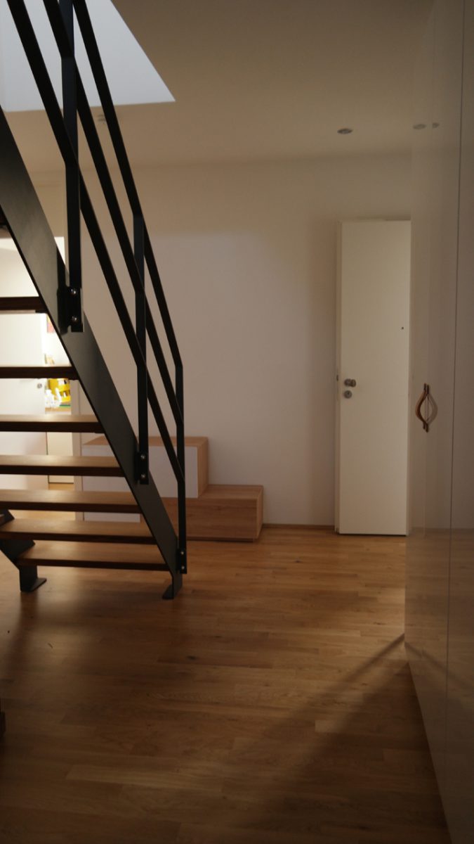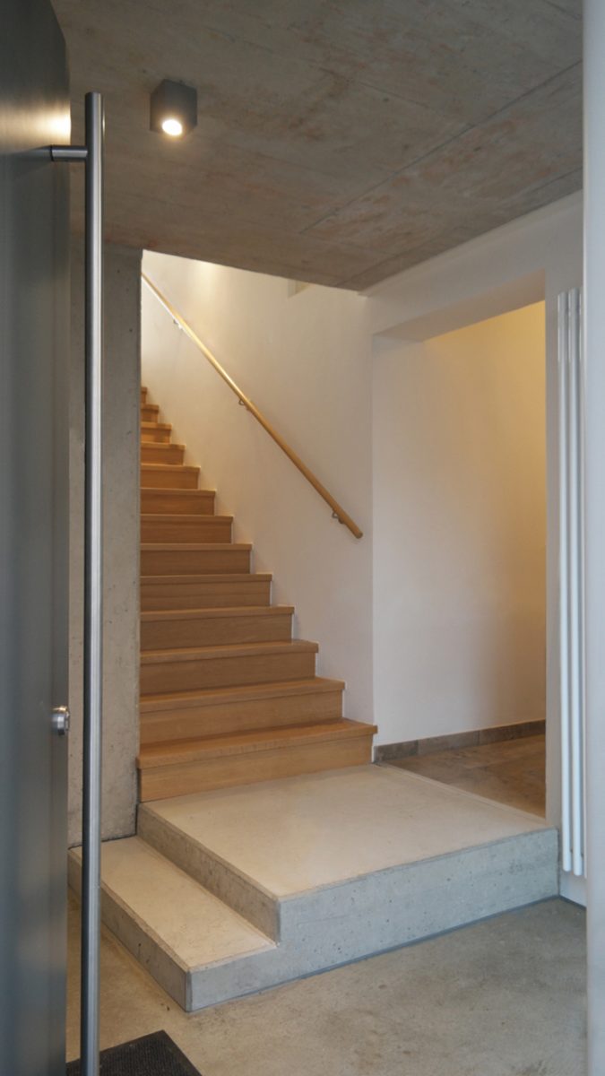 Die gemeinsame Erschließung erfolgt von der Nordseite. Im Bestand konnte das historische Treppenhaus erhalten werden. Im Neubau sind zwei Wohneinheiten entstanden, die obere Wohnung als Maisonettewohnung über zwei Geschosse.